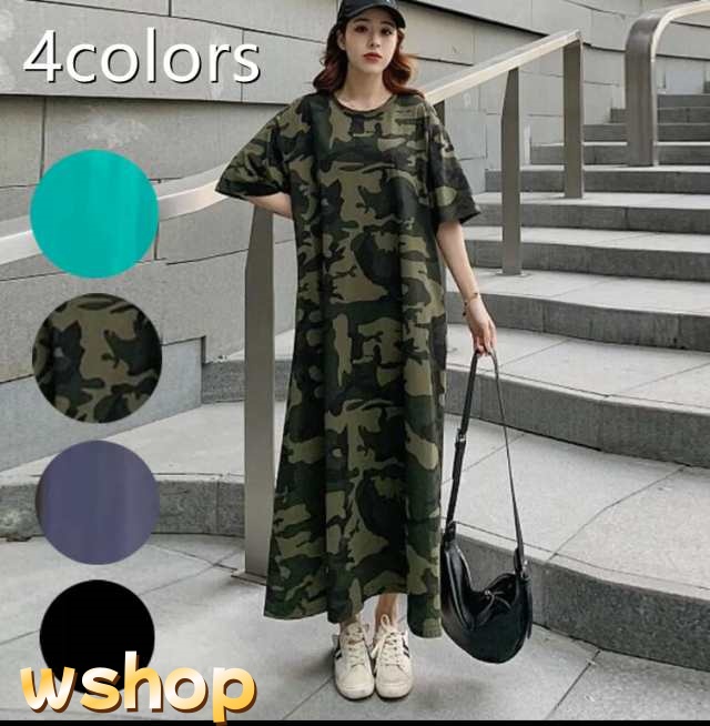 【送料無料】ワンピース レディース ロングワンピース Tシャツ 迷彩柄 カモフラージュ柄 マキシワンピース ロング リゾート マキシ丈 大人 きれいめ Aライン フレアワンピース 半袖 大きいサイズ ナチュラル 森ガール 体型カバー ゆったり 春 夏 秋 シンプル カジュアル