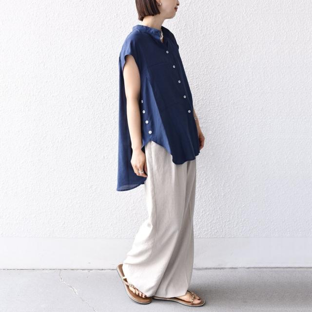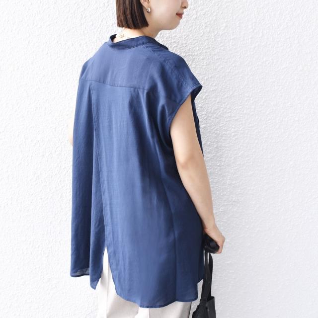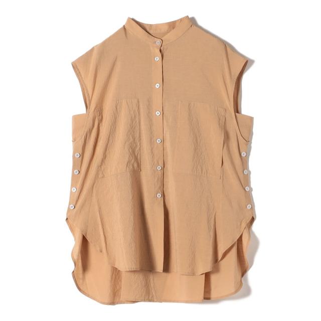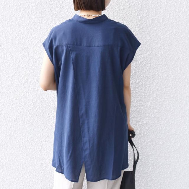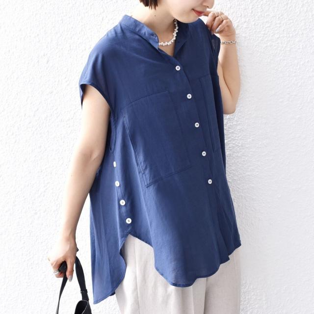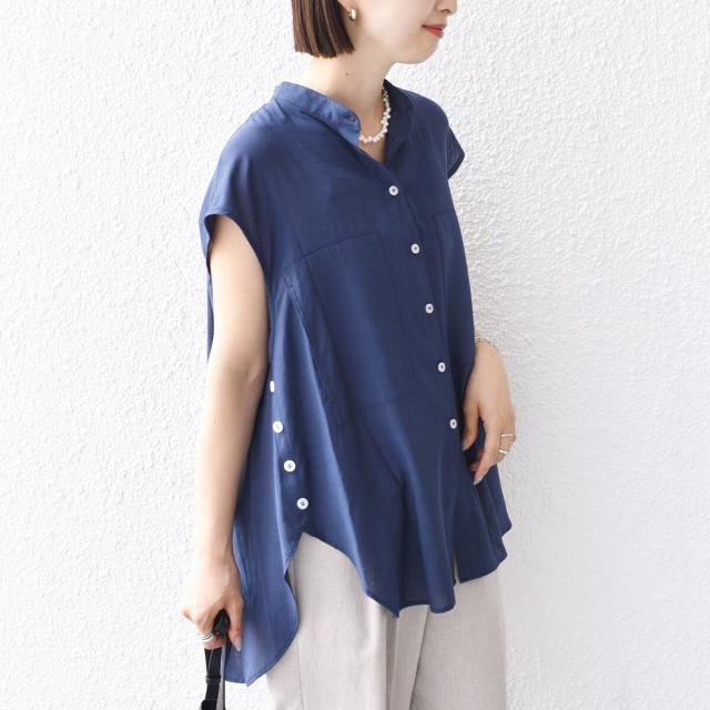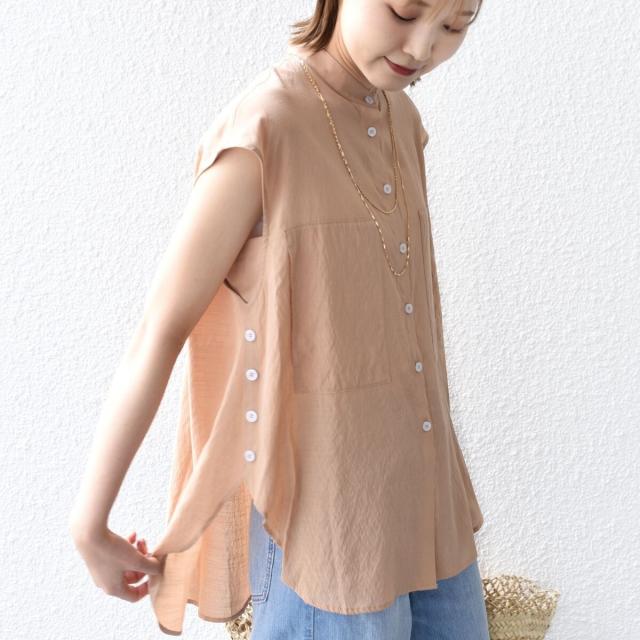 サイドのボタンと背中のレイヤードデザインが魅力の一枚着ブラウス。