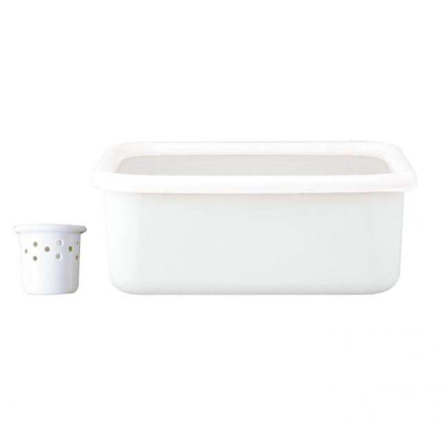 材質:本体/ほうろう用鋼板、蓋/ポリプロピレン(縁:エラストマー)、水取り器/陶器