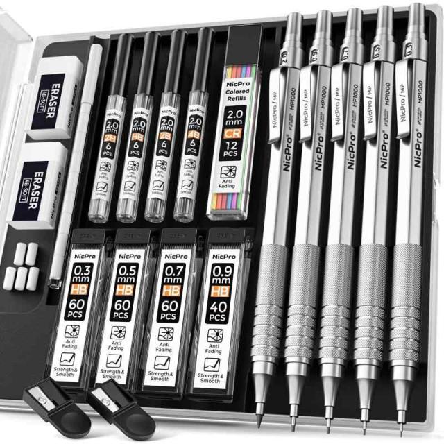 Nicpro アートシャープペンシル5本セット メタル製図用鉛筆 0.3 0.5 0.7 0.9 2mm グラファイト製芯ホルダー (4B 2B HB 2H 色鉛筆) 筆記 スケッチ 描画用 替え芯消しゴム9本付き