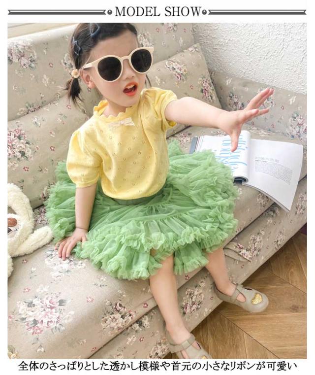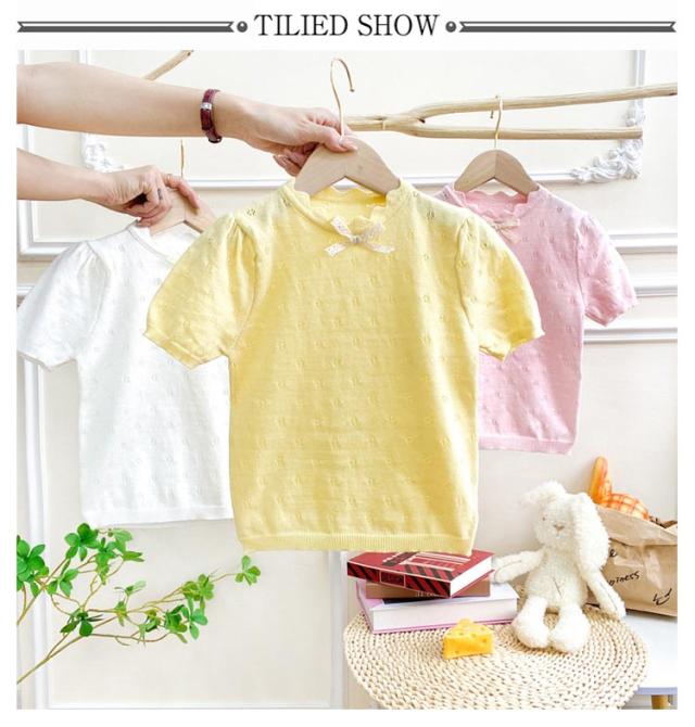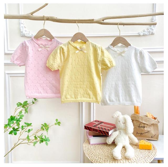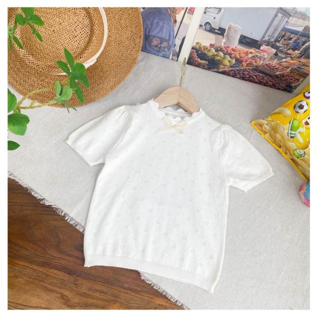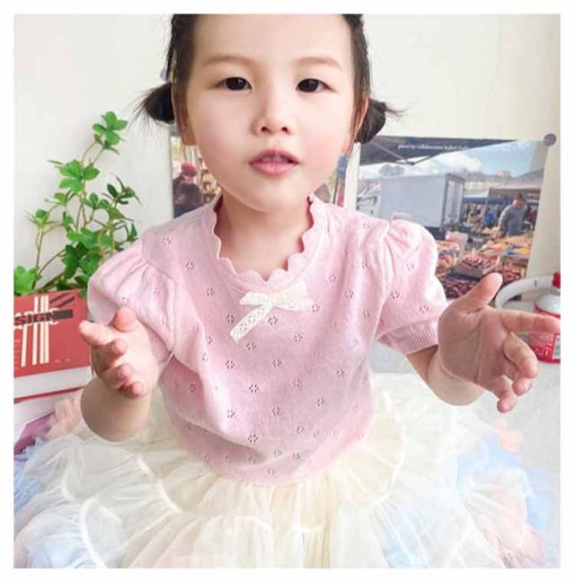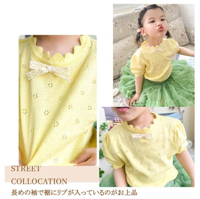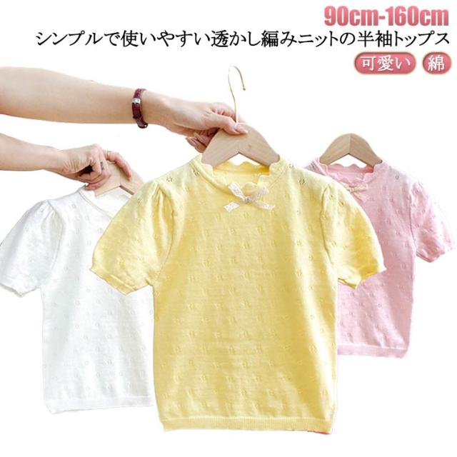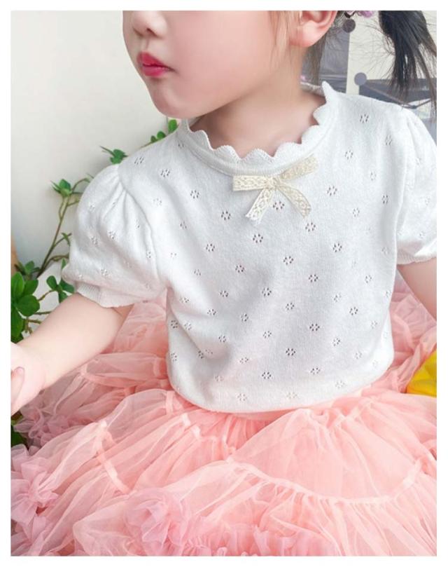 キッズ ベビー 女の子 トップス ニットトップス 半袖 レース リボン 透かし編み ニット コットン 半袖 パフスリーブ 可愛い 90cm 100cm 110cm 120cm 130cm 140cm 150cm 160cm 子供服 春 夏 秋 送料無料
