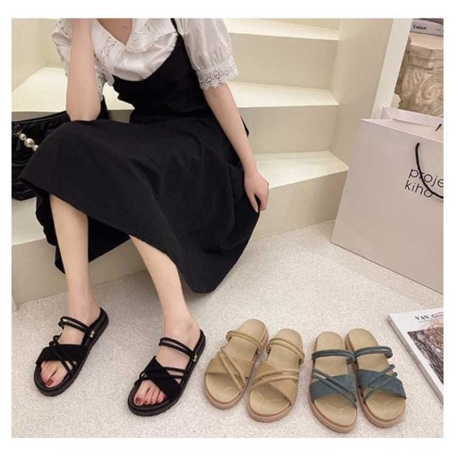 サンダル レディース カワイイ ダブルストラップサンダル 3cmヒール レディース 春夏 ミュール ブラック ベージュ ぺたんこ ローヒール フラット アンクルストラップ シンプル 履きやすい クッション 送料無料