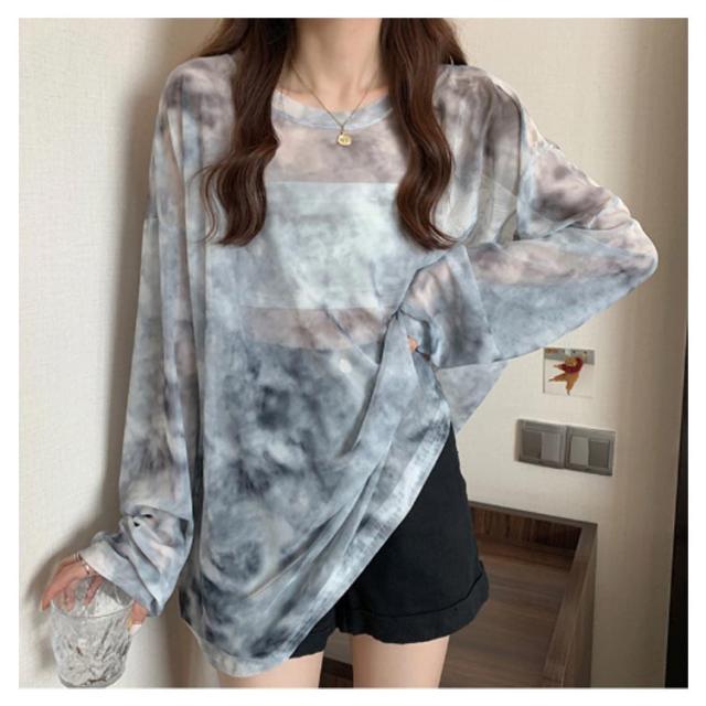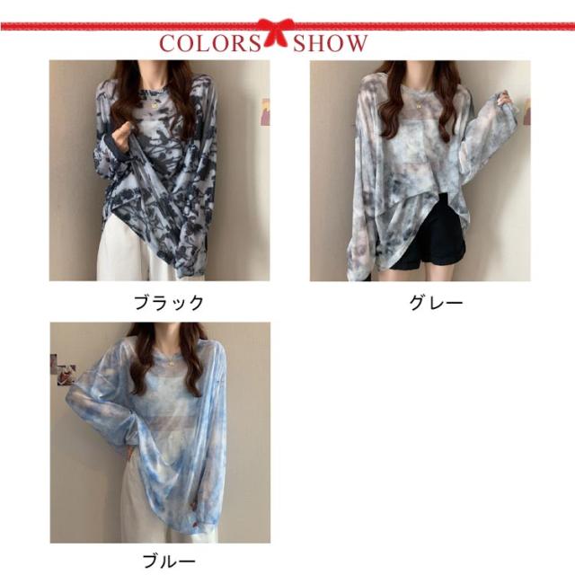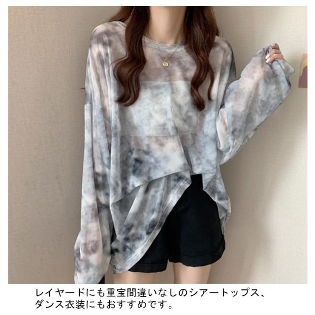 【2枚セット】 シアートップス 長袖 タイダイ柄シアーシャツ 春夏 透け感 シースルー Tシャツ 大きいサイズ ビッグシルエット クルーネック シアーブラウス カットソー レイヤードトップス 重ね着