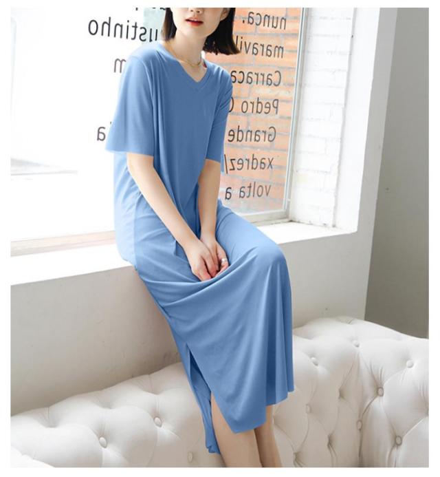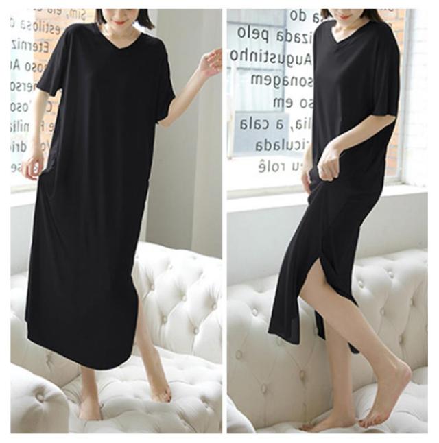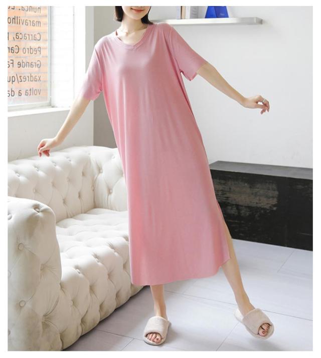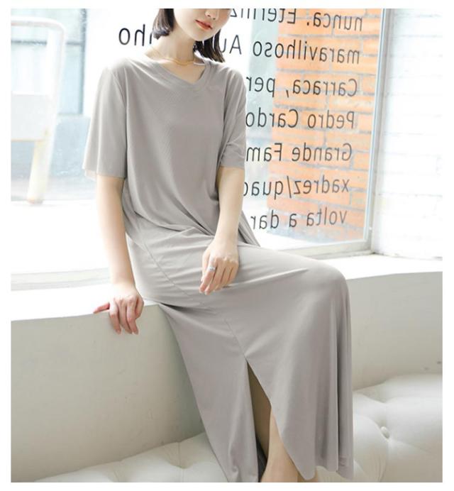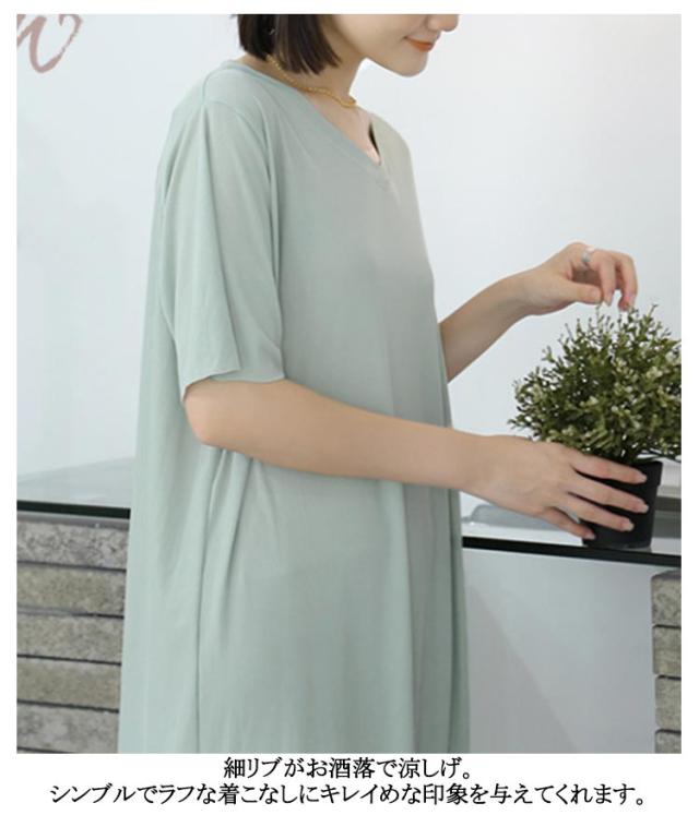 ワンピース 寝間着 パジャマ 半袖 丈 夏 接触冷感 部屋着 ミモレ ワンピース 寝巻き tシャツ ロンT ルームウェア ロング丈 丈 Vネック マキシ 接触冷感 涼しい リブ 裾スリット サイド スリット
