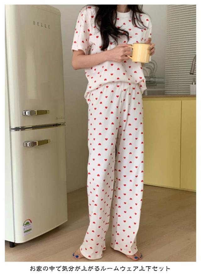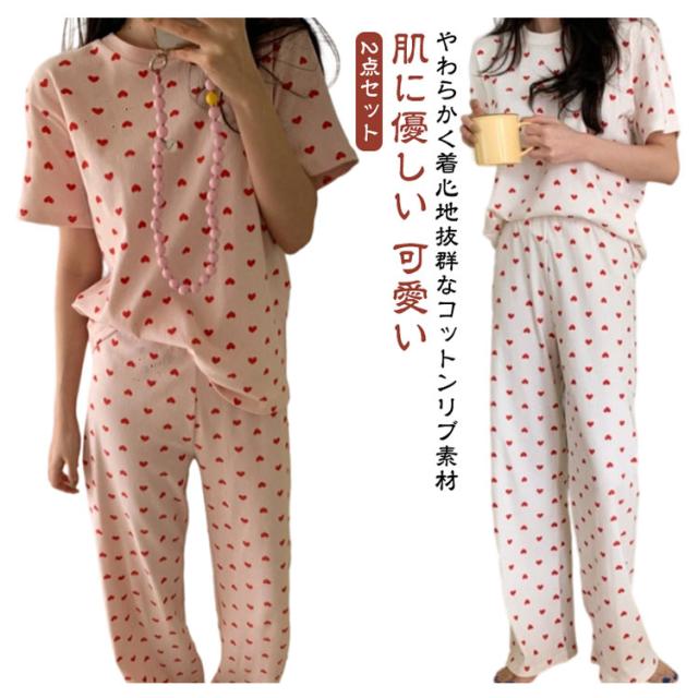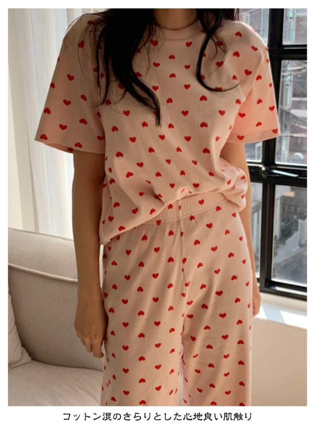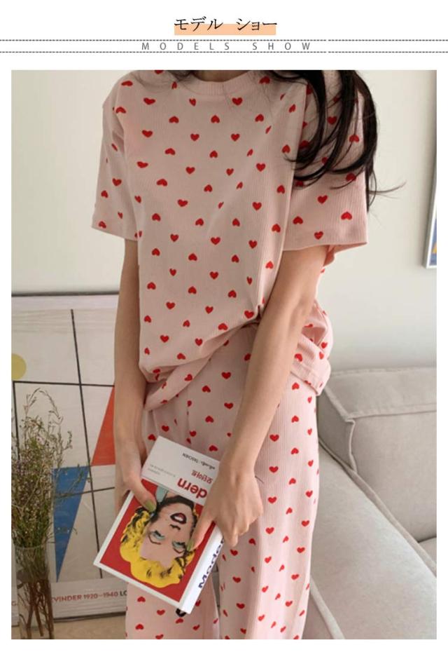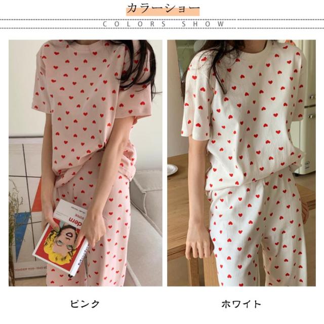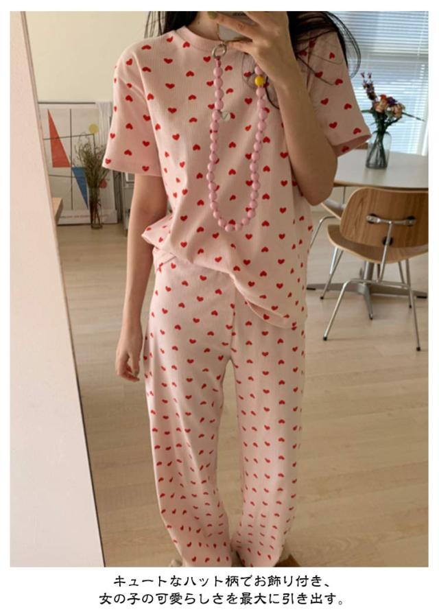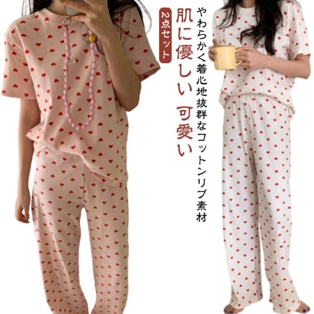 セットアップ 寝巻き パンツ ワンマイルウェア 部屋着 リブニット 2点セット パジャマ 寝間着 レディース リブ 上下セット 半袖 tシャツ ロング 夏 ルームウェア 半袖tシャツ ラウンドネック 丸首 ロングパンツ ハート 柄