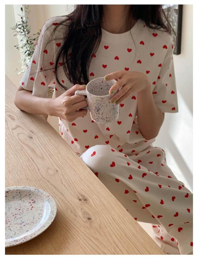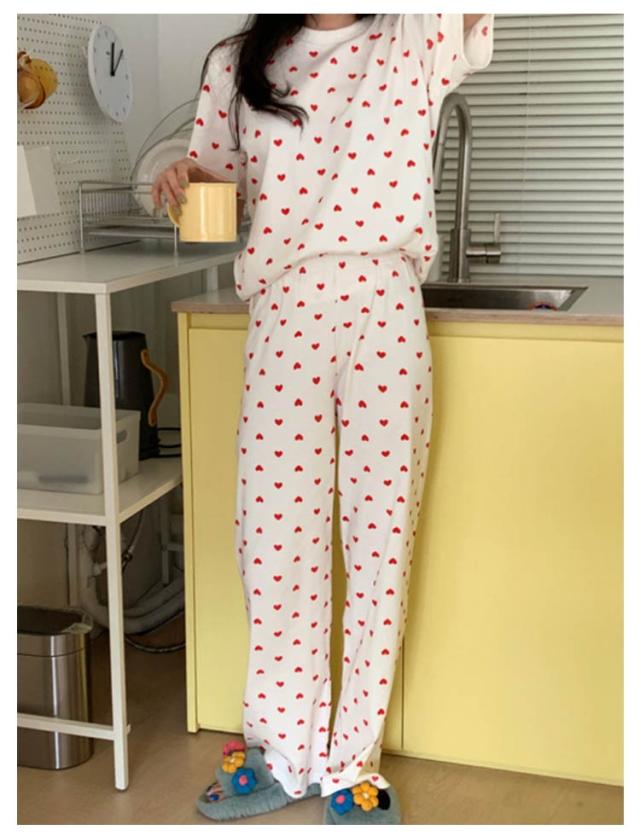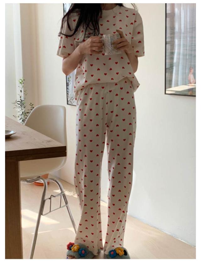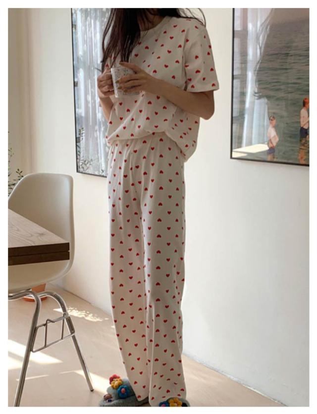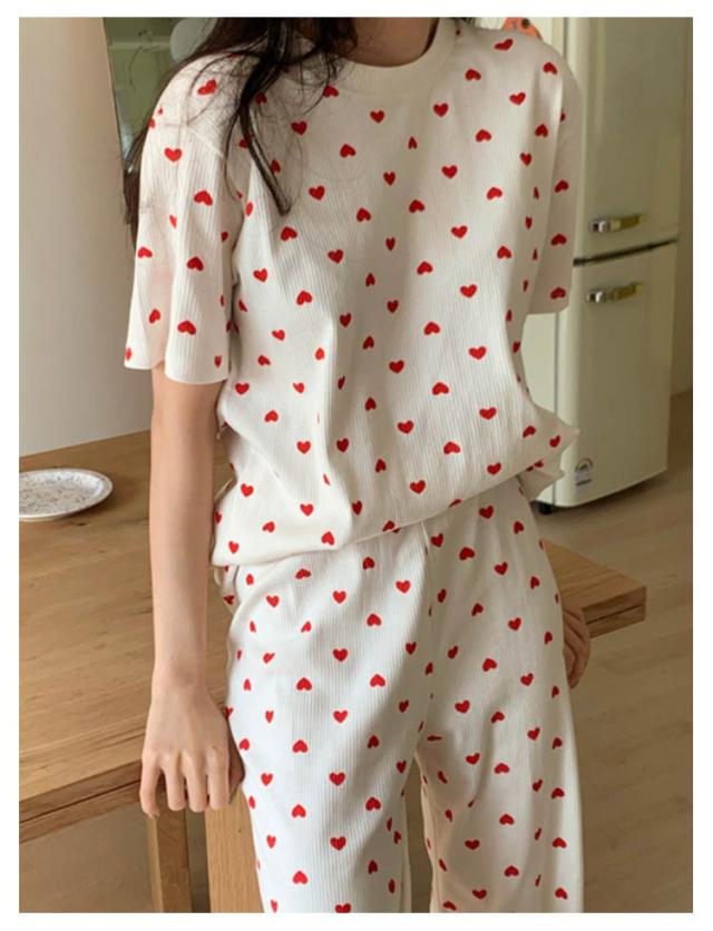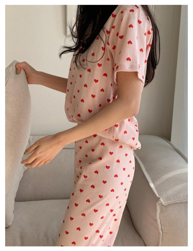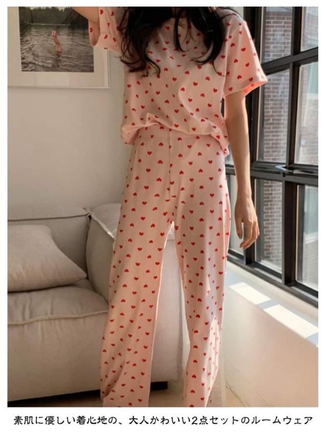 セットアップ 寝巻き パンツ ワンマイルウェア 部屋着 リブニット 2点セット パジャマ 寝間着 レディース リブ 上下セット 半袖 tシャツ ロング 夏 ルームウェア 半袖tシャツ ラウンドネック 丸首 ロングパンツ ハート 柄