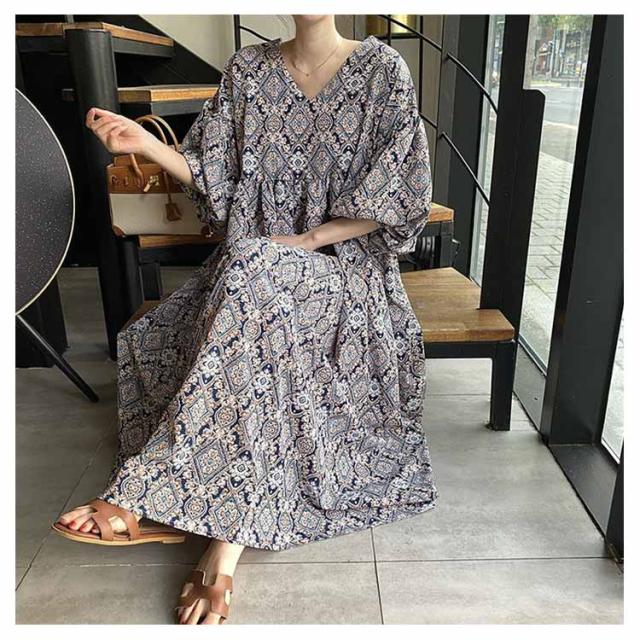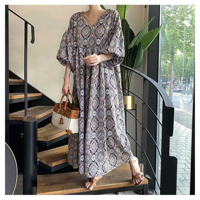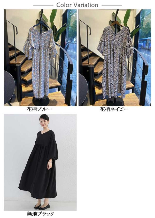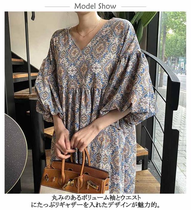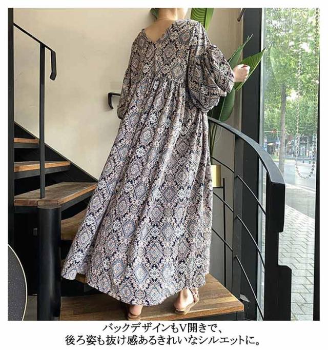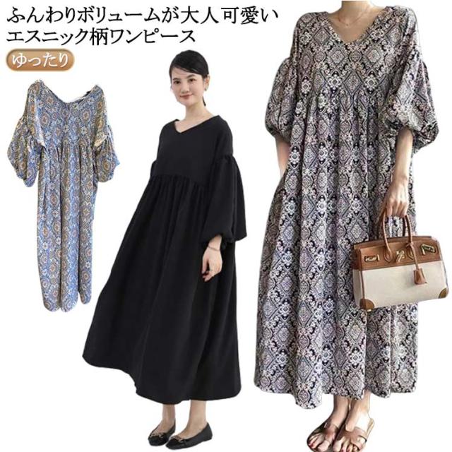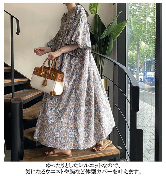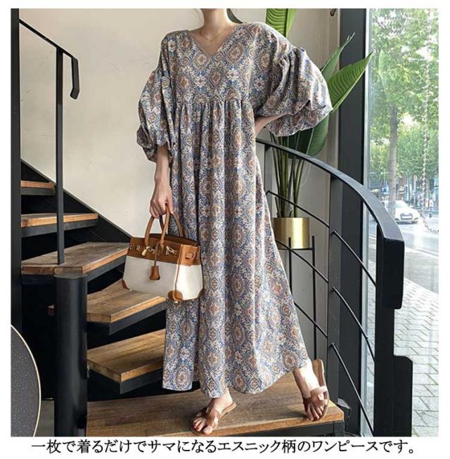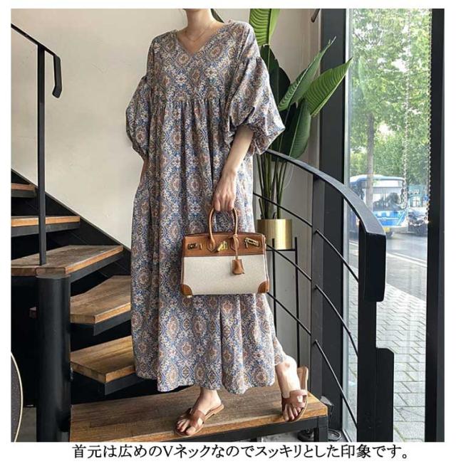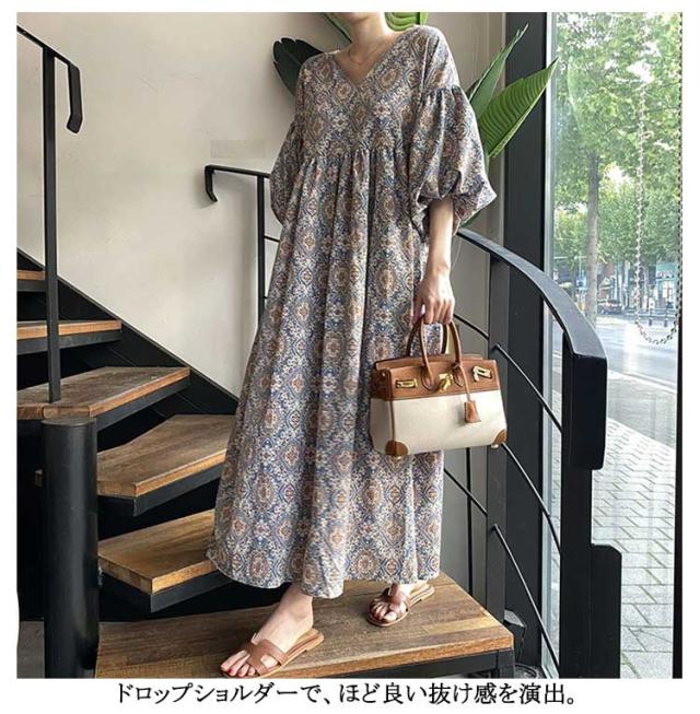 ストレッチ ロング Vネック Aライン ロングワンピース 花柄フレアワンピース 花柄フレアワンピース ドロップショルダー 総柄 ビッグシルエットボリューム袖 エスニック風 ゆったり 無地 ハイウエスト マキシ丈 楽ちん 体系カバー 大人可愛い レディース 春夏 韓国ファッション
