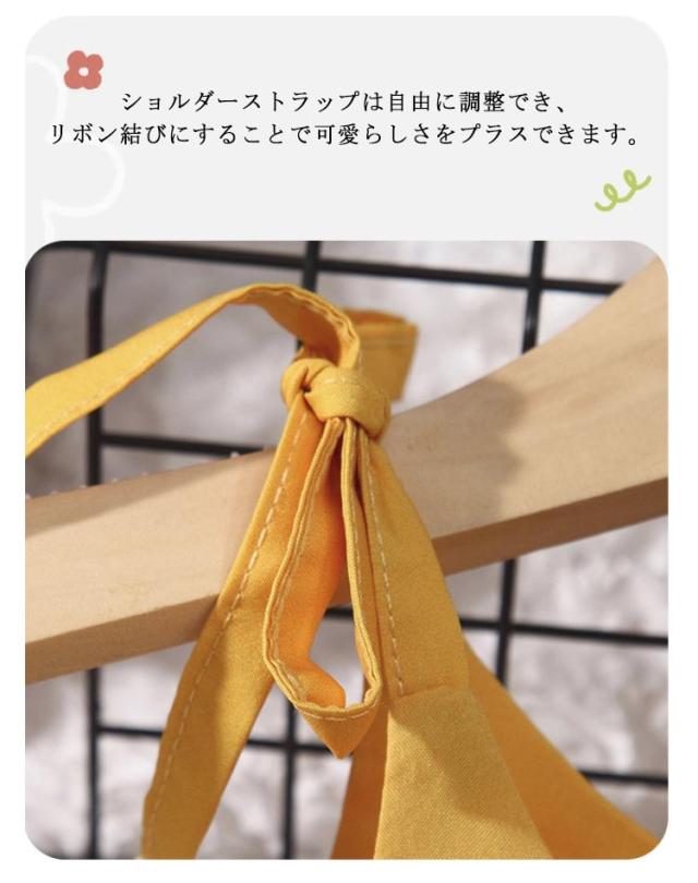 | 上質なコットン素材で、肌に優しく通気性に優れています。 ショルダーストラップは自由に調整でき、リボン結びにすることで可愛らしさをプラスできます。 ひまわり柄は可愛らしく鮮やかな黄色で、特に夏にぴったりです。 ギフトにも最適です。 | |
