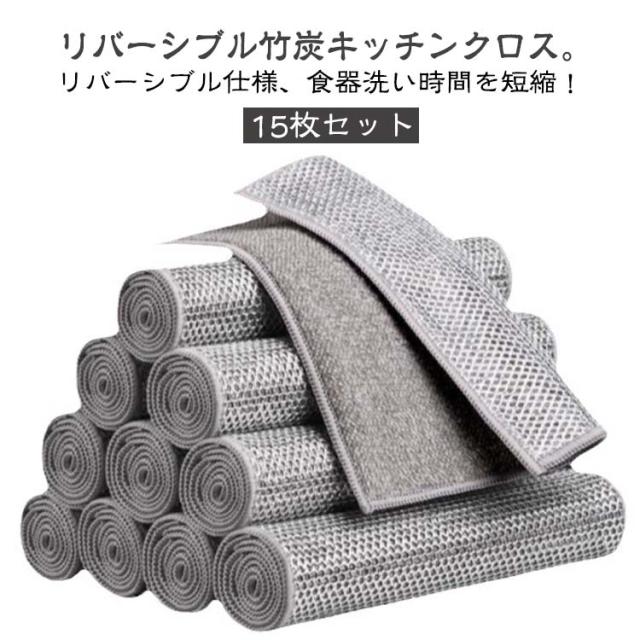 キッチンクロス 【15枚セット】リバーシブル 銀糸入り 耐熱 キッチンタオル メッシュふきん お手入れ簡単 耐久性 ワイヤーふきん 防油 【15枚セット】リバーシブル 両面使用 繰り返し使用 食器洗い 竹炭 竹炭キッチンクロス 吸水 速乾 20×20cm