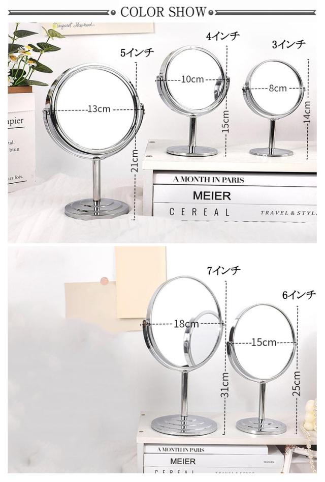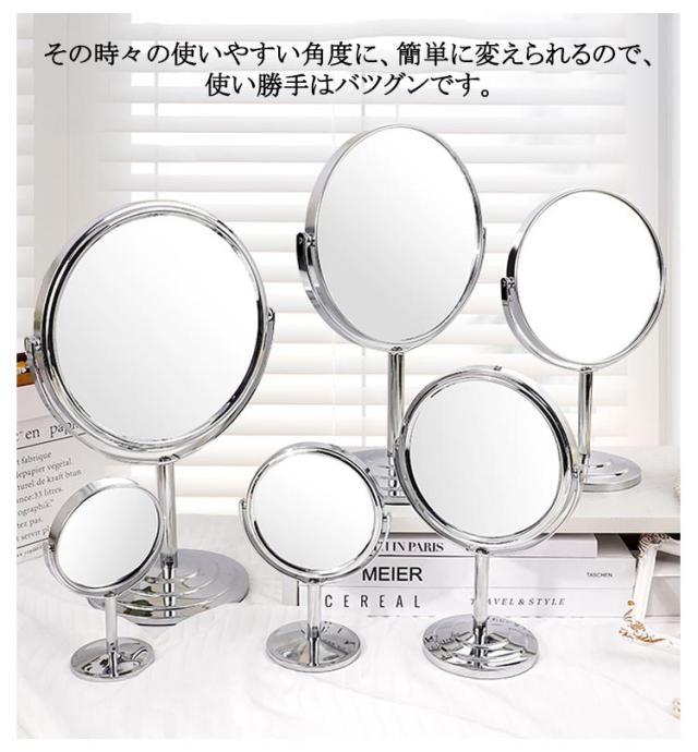 | 2倍拡大 3/4/5/6/7/8インチ 本来の姿をありのままに映し出す鏡です。 鏡面部分はなんと、360度・自由な角度に回転可能です。 その時々の使いやすい角度に、簡単に変えられるので、使い勝手はバツグンです。 2倍拡大機能がありますので、化粧、顔剃りや白髪抜きは使いやすいです。 転落防止、机の傷つき防止、底面に厚さ約2mmの滑り止め付き。 肌の色がより鮮明に映ることで、自分にあったファンデーションの色味がわかり、メイクの仕上がりが格段によくなります。 | |