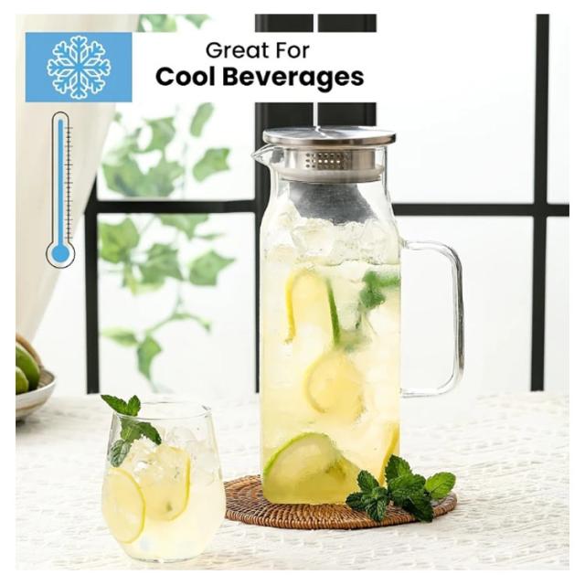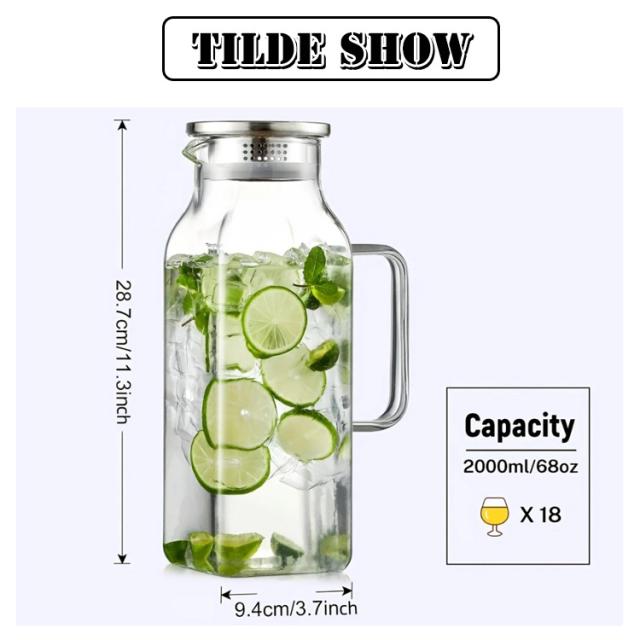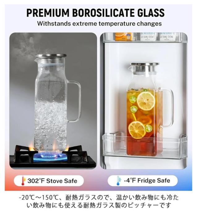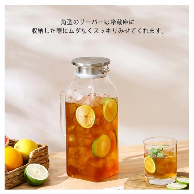 | 角型で冷蔵庫のスペースを有効活用2Lガラスピッチャー。【ステンレス茶こし一体型蓋】 ボトルの口径が大きく、手が直接差し込めて清潔できます 麦茶、紅茶、ジュース、コーヒー、ミルクなどの飲み物を淹れたい時にご気楽にお使えいただけます。-20℃〜150℃、耐熱ガラスので、温かい飲み物にも冷たい飲み物にも使える耐熱ガラス製のピッチャーです 角型のサーバーは冷蔵庫に収納した際にムダなくスッキリみせてくれます。 | |