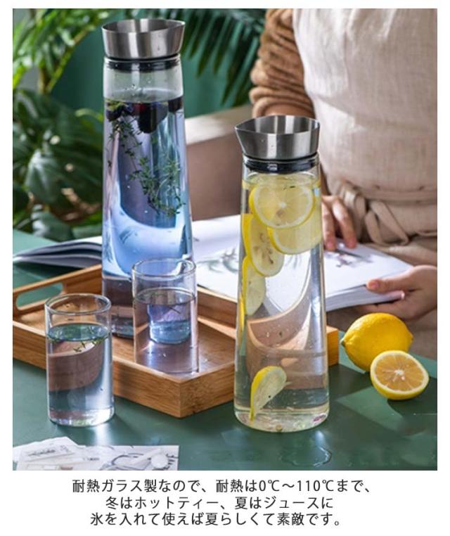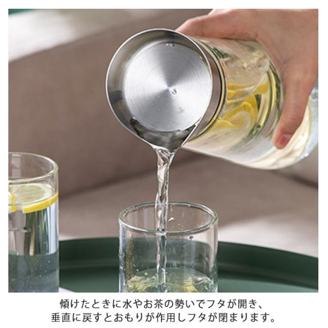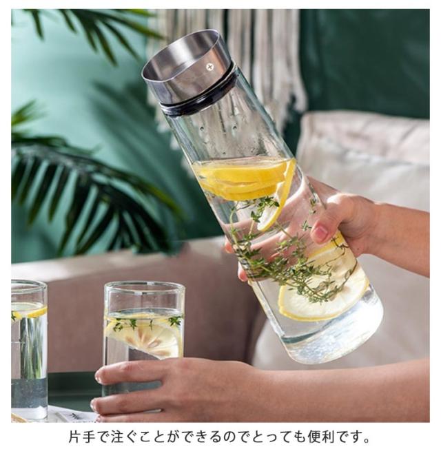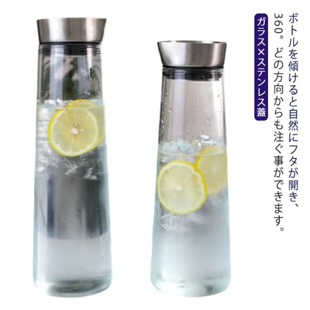 | ボトルを傾けると自然にフタが開き、360°どの方向からも注ぐ事ができます。【ガラス×ステンレス蓋】 持つ向きを変えることなく、スムーズにグラスへと注ぐことができる。 片手で注ぐことができるのでとっても便利です。 傾けたときに水やお茶の勢いでフタが開き、垂直に戻すとおもりが作用しフタが閉まります。 耐熱ガラス製なので、耐熱は0℃〜110℃まで、冬はホットティー、夏はジュースに氷を入れて使えば夏らしくて素敵です。 ステンレス製の蓋は清潔に保ちやすく、さらには高級感も演出してくれることでしょう。 | |
