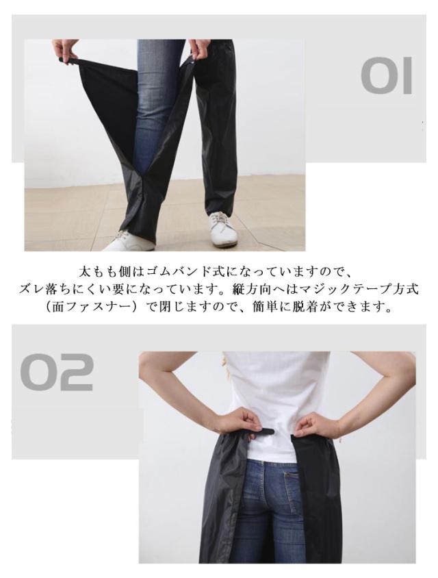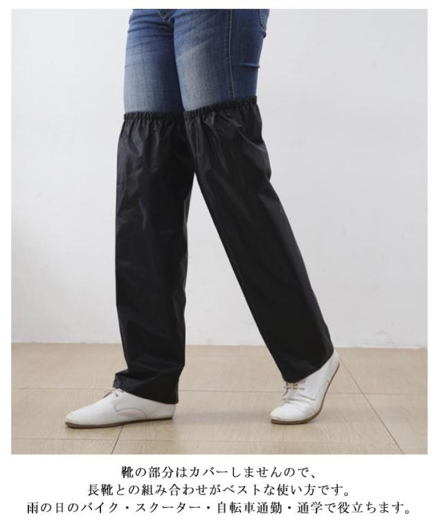 | 簡単装着!足首からひざ上丈まですっぽり覆ってくれる、ロング丈のレインレッグカバー。マジックテープでつなげて合体させると、エプロンに変身する2WAY仕様! 靴を履いたままカンタンに脱着ができる、脚だけのレインコートです。フルオープンタイプのレッグカバーなのでオーバーパンツを履くより簡単に雨からズボンを守ります。 太もも側はゴムバンド式になっていますので、ズレ落ちにくい要になっています。縦方向へはマジックテープ方式(面ファスナー)で閉じますので、簡単に脱着ができます。 左右セットの商品ですが、2つを組み合わせると腰回りの防水エプロンとしても使用可能です。 靴の部分はカバーしませんので、長靴との組み合わせがベストな使い方です。雨の日のバイク・スクーター・自転車通勤・通学で役立ちます。 | |