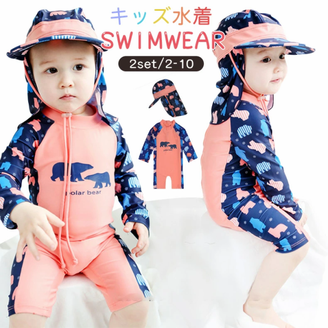 ベビー水着 男の子 子ども水着 ベビー 水着 キッズ 男の子 子供水着 こども 2点セット かわいいクマ柄 オールインワン ラッシュガード 長袖 フィットネス水着 boy みずぎ スイムウェア UV対策 日焼け防止帽子付け 80cm 90cm 100cm 110cm 120cm 130cm