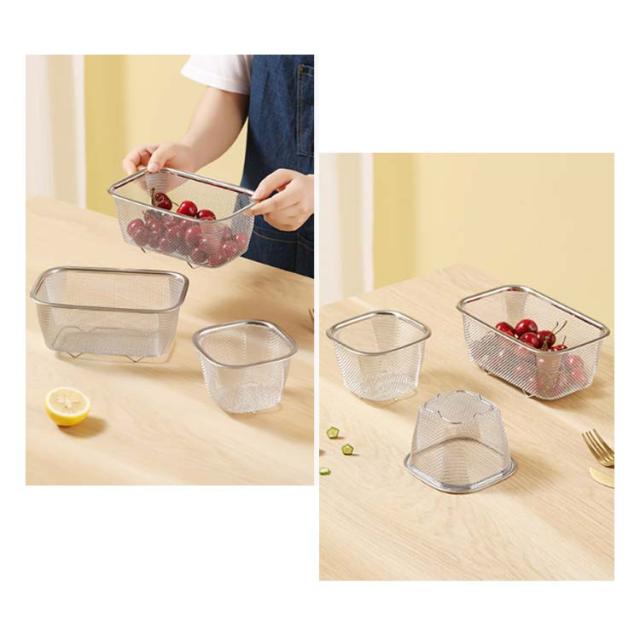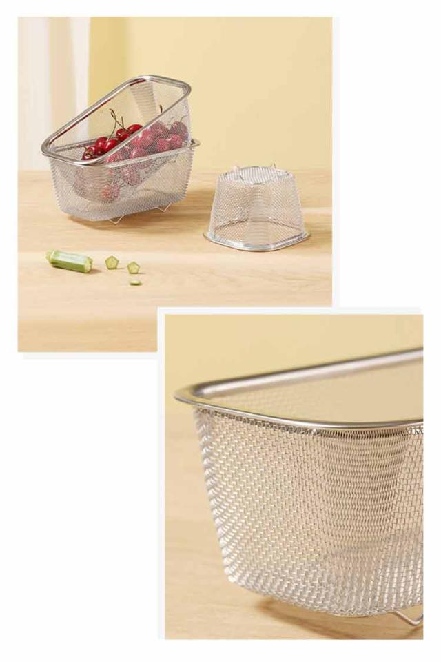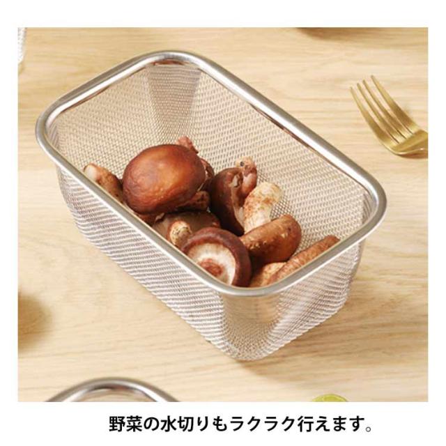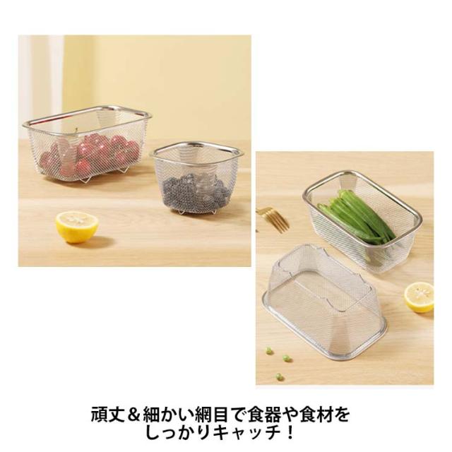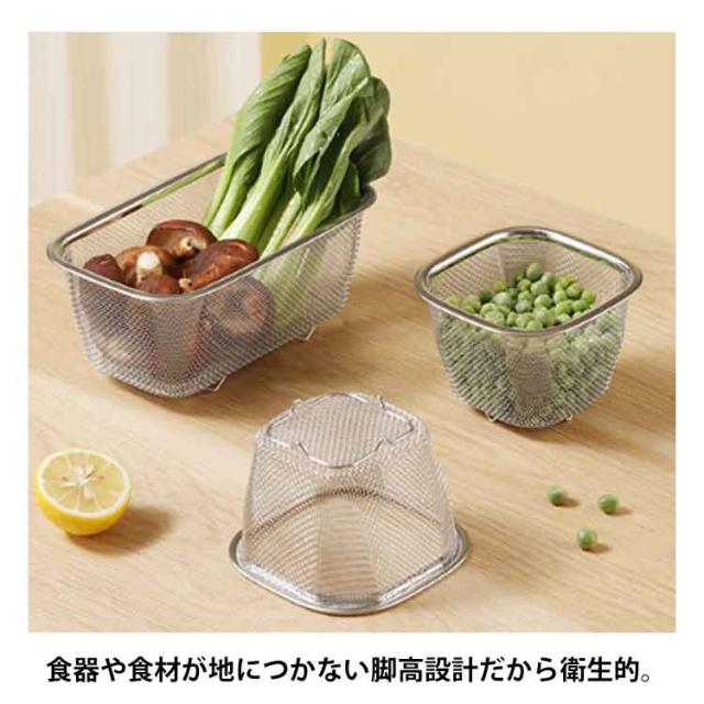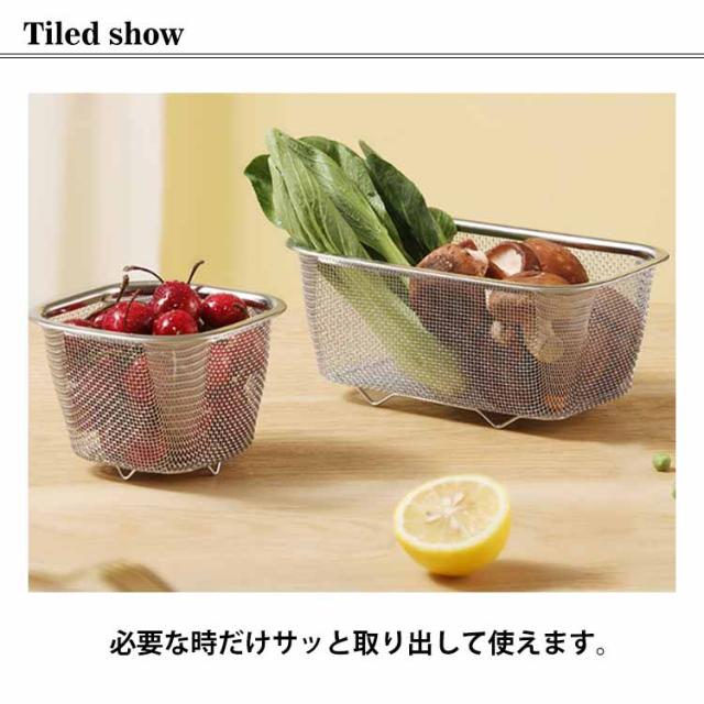 | ・シンク横にすっきり置けるコンパクトサイズ! ・必要な時だけサッと取り出して使えます。 ・野菜の水切りもラクラク行えます。 ・頑丈&細かい網目で食器や食材をしっかりキャッチ! ・食器や食材が地につかない脚高設計だから衛生的。 | |
