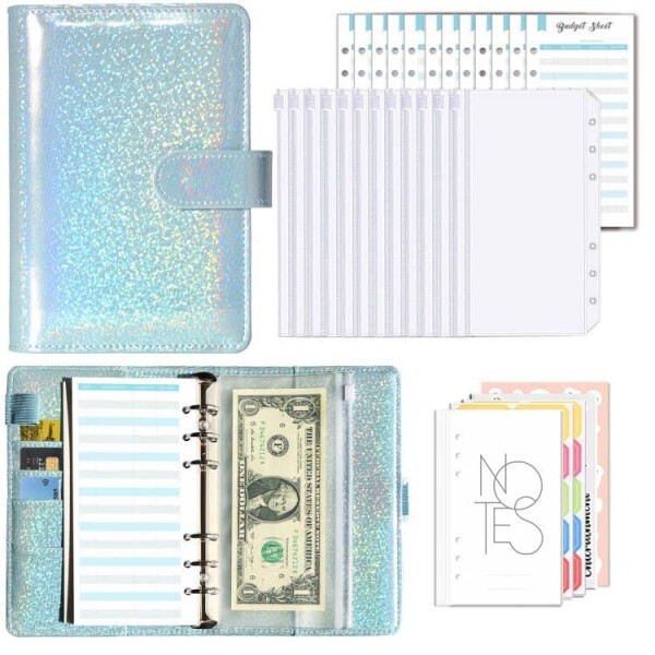 Sitengle A6 バインダー 6穴 予算バインダー ポケット12個付き ラベル付き便利セット キラキラ オシャレ 家計管理 お金管理 家計簿 書類・伝票・名刺・メモ紙入れ ルーズリーフバインダー