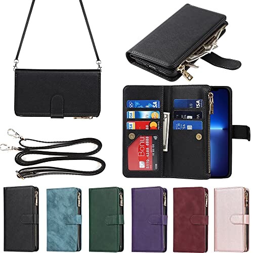 アイフォンiPhone 13 Pro Max ケース for iPhone 13promax 縄掛けケース 手帳型 財布型 ICカード コインポケット ストラップ付き カード 収納 小銭入れ ファスナーポケット付き PUレザー 6色 ブラック