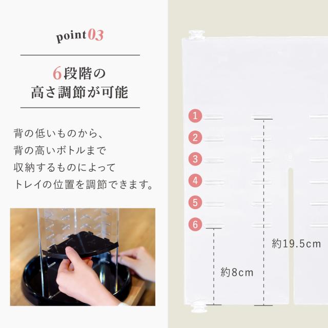 【6段階の高さ調整が可能】背の低い物から、背の高いボトルまで収納する物によってトレイの位置を調節できます。