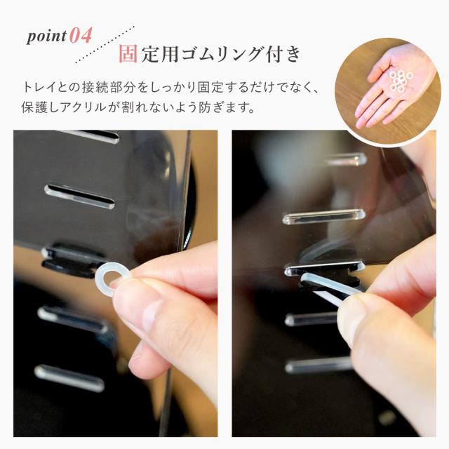 【固定用ゴムリング付き】トレイとの接続部分をしっかり固定するだけでなく、保護しアクリルが割れないように防ぎます。
