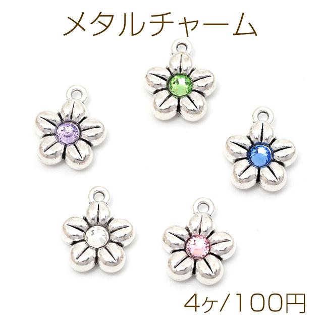 メタルチャーム フラワー お花 銀古美 石付き ペンダントパーツ 合金製 約12×15mm(4ヶ)