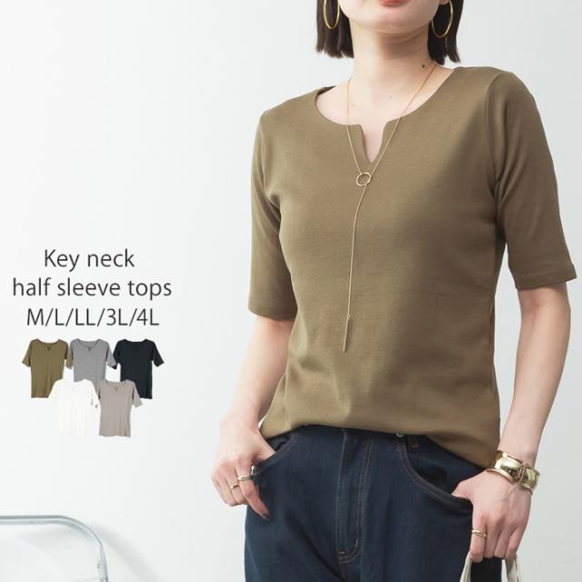 キーネックコットン5分袖トップ メール便送料無料 5分袖 コットン 綿 トップス 無地 レディース 5カラー 5サイズ 0511