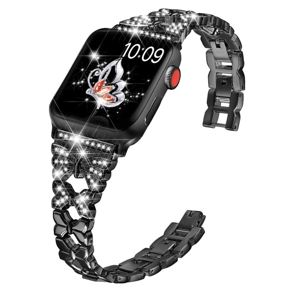 互換 Apple Watch バンド ステンレス アップルウォッチ ベルト レディース series9/8/7/6/5/4/3/2/1/SE対応 アップルウォッチバンド 蝶ネクタイの形 ダイヤモンド キラキラ (ブラック, 42mm/44mm/45mm/49m