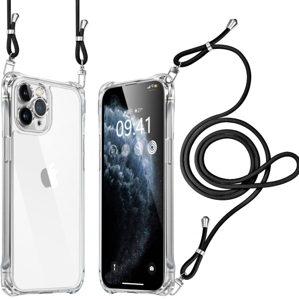 iPhone 11pro ケース クリア ショルダー 耐衝撃 レンズ保護 肩掛け 首かけ 斜めがけ 縄掛け カバー 調節可能な 透明 落下防止 縦/横 紛失防止 2WAY (ブラック)