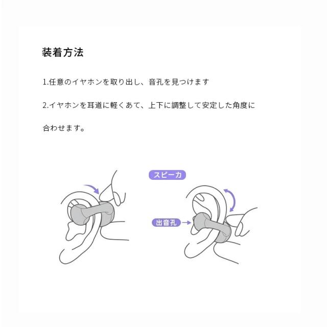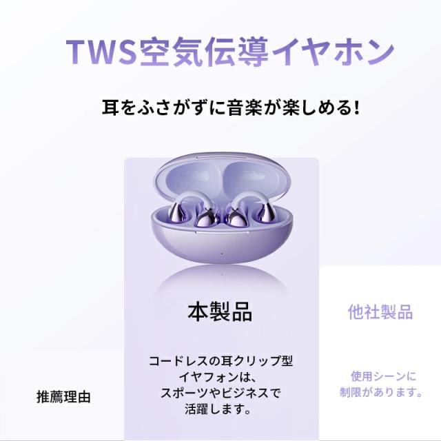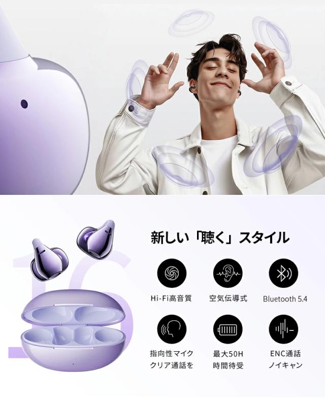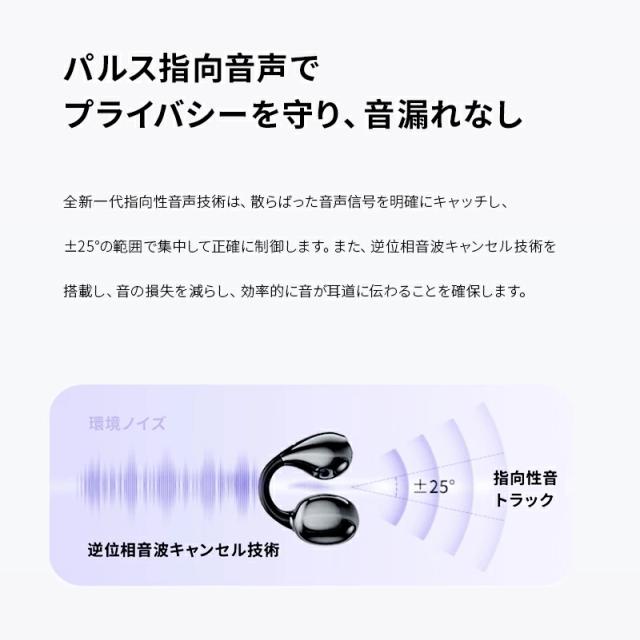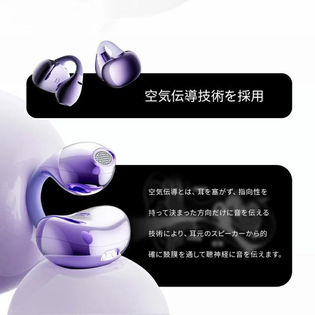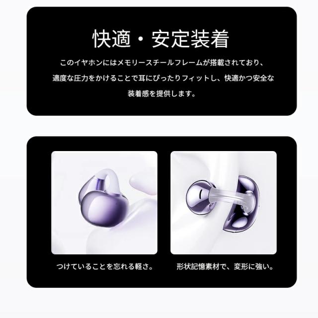 長時間の装着を考慮し、快適性を優先して設計で、イヤーカフのように、耳に挟むだけで耳を塞がなく使用できます。イヤホンを耳穴に挿入しないため、耳を覆うような圧迫感がなく、長時間使用しても耳穴が蒸れにくく快適です。