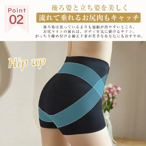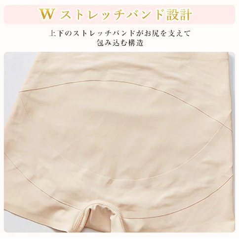 【後ろ姿と立ち姿を美しく】 上下のストレッチバンドがお尻を支えて包み込むので自然とヒップアップ。 お尻のたるみをナチュラル補正し、キュッと上がった小尻へ!後ろ姿に自信を取り戻します。