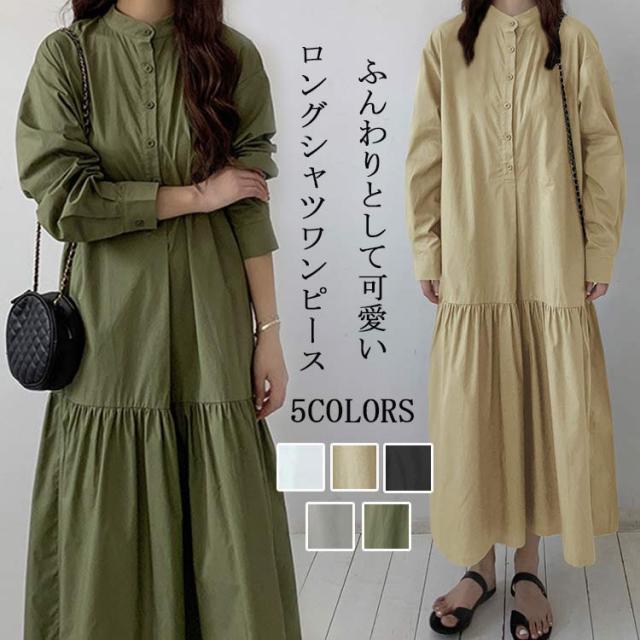 シャツワンピース レディース 綿 ロングワンピース 長袖 立ち襟 ドッキング ボタン シャツワンピ 無地 Aライン フレア ワンピース 綿混 ロング丈 体型カバー ゆったり ロングシャツ 春 夏 秋 オシャレ フレアワンピース シンプル カジュアル 大人 OL 通勤