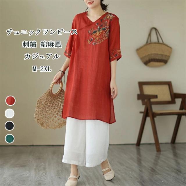 刺繍 チュニック レディース チュニックワンピース 半袖 夏 ブラウス ロング スリット Vネック エスニック 綿麻風 半袖ブラウス ゆったり 体型カバー Tシャツ ワンピース 無地 プルオーバー シンプル オフィス 通勤 夏シャツ おしゃれ レトロ