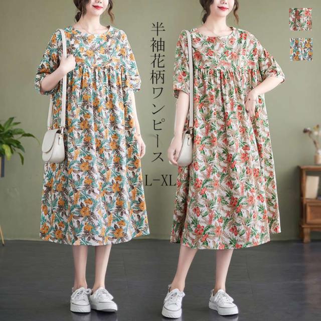 花柄ワンピース レディース 綿 ロングワンピース 春 夏 クルーネック 半袖 花柄 ミモレ丈 ワンピース プリント 総柄 リゾートワンピース 大きいサイズ プルオーバー ミモレ丈ワンピース ゆったり 体型カバー フレアワンピース きれいめ カジュアル お出かけ 涼しい