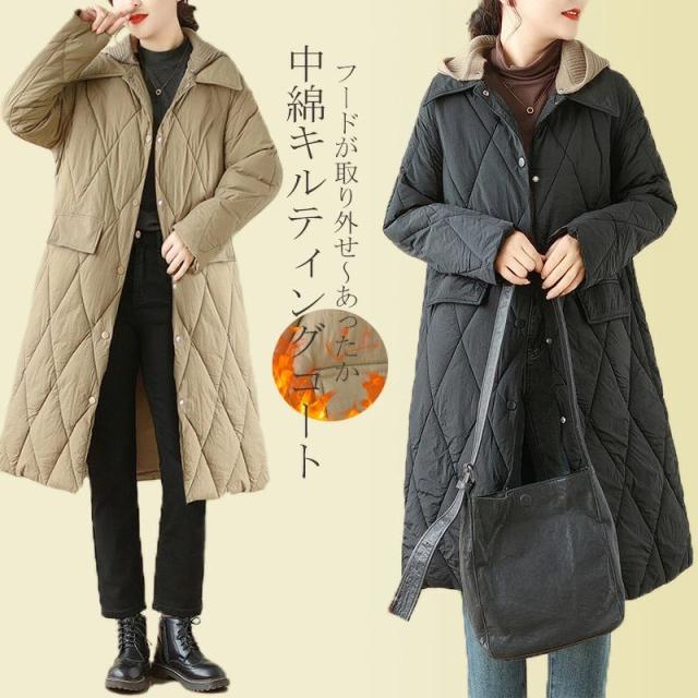 中綿 キルティングコート レディース 中綿コート チェック コート ジャケット 中綿コート フード付き 膝丈コート ポケット付き カギホック 長そで ニットフード切り替え 無地 体型カバー シンプル あったか 着回し ブラック ベージュ 冬 ゆったり カジュアル 通勤