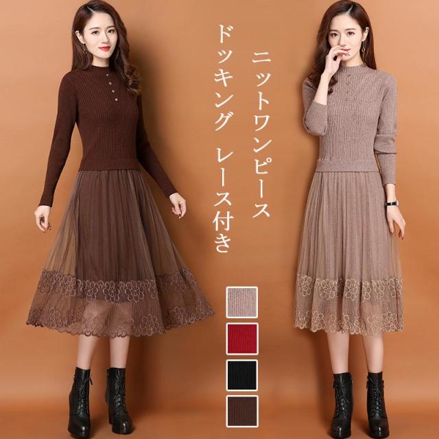 ニットワンピース レディース 秋冬 ニット ワンピース ロング丈 長袖 レース ドッキング ニットワンピ リブ リブニット フレア ロングワンピース ゆったり 体型カバー セーターワンピース 柔らかい フレアワンピース 着痩せ オシャレ 大人 フォーマル OL 通勤