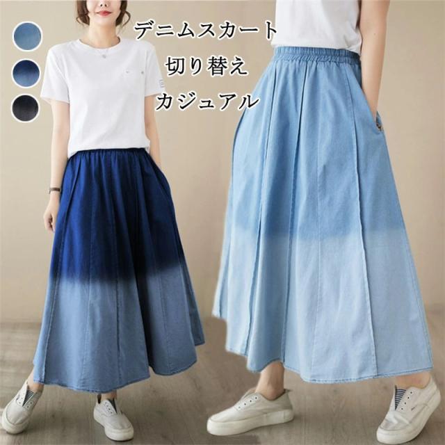 デニムスカート 切り替え レディース フレアスカート ウエストゴム ロングスカート デニム ポケット付き Aラインスカート ドッキング 2色スプライス フレア スカート ロング Aライン 無地 マキシスカート ゆったり 大きいサイズ カジュアル オシャレ 通勤