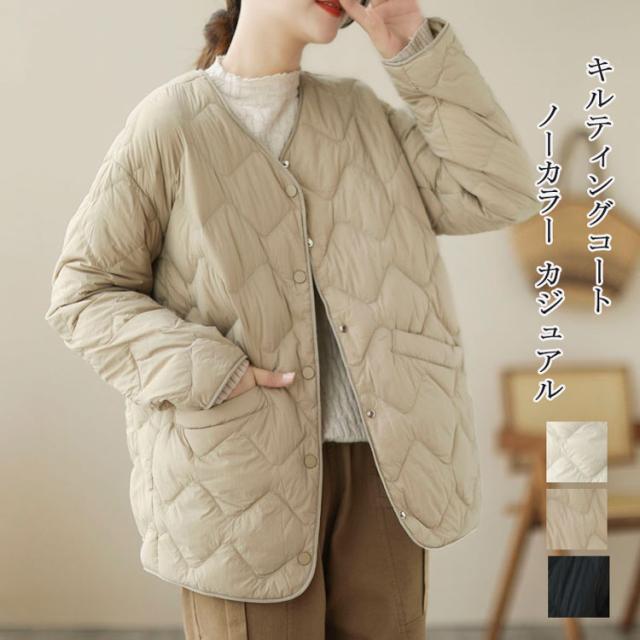 キルティングジャケット レディース 秋冬 キルティングコート 長袖 ポケット付き ノーカラー ジャケット 中綿 前開き 中綿コート ショート丈 アウター 大きいサイズ ダウンジャケット 無地 冬物 軽量 コート カジュアル 防寒 暖かい あったか