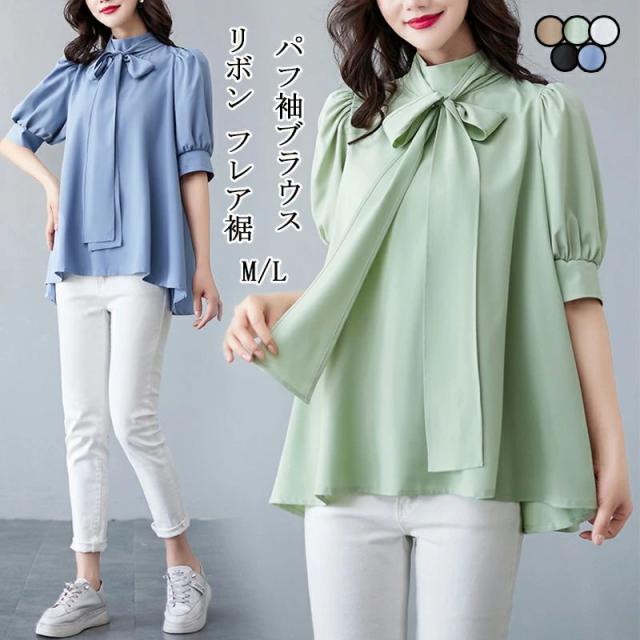 ブラウス パフスリーブ レディース シャツ 半袖 フォーマル リボン シャツブラウス フレア Aライン ボウタイ ぽわん袖 チュニック 後ろリボン ハイネック ボリューム袖 トップス 大きいサイズ 体型カバー 大人 可愛い きれいめ オフィス 通勤 通学 春夏