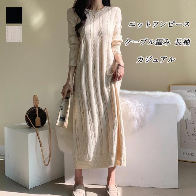 ニットワンピース レディース 秋冬 ニット ワンピース ミモレ丈 セーター 長袖 ケーブル編み 丸襟 スリット 無地 ロングニット フレア ゆったり プルオーバー ロングワンピース ロング丈 体型カバー 長袖セーター おしゃれ 暖かい 通勤 普段着 カジュアル 大人
