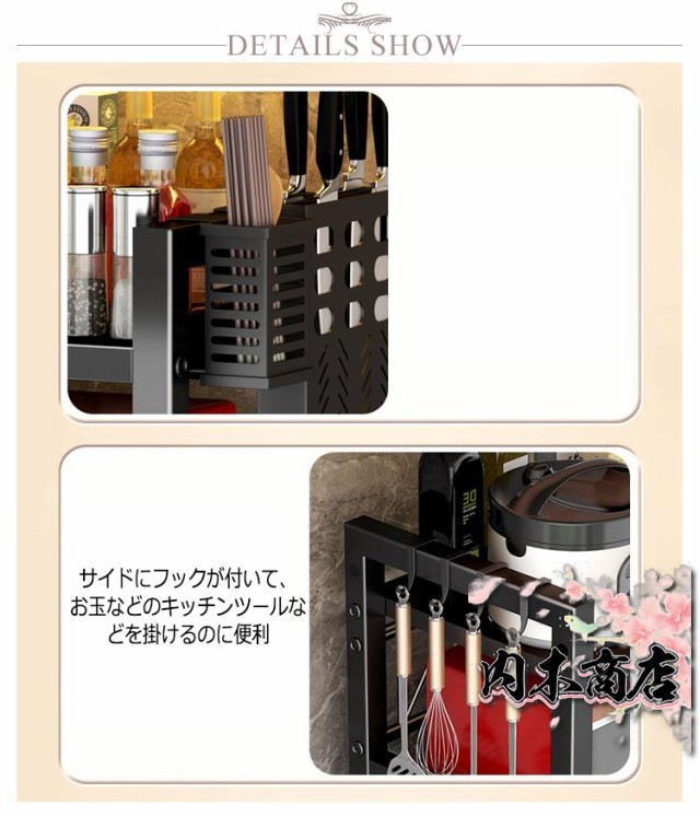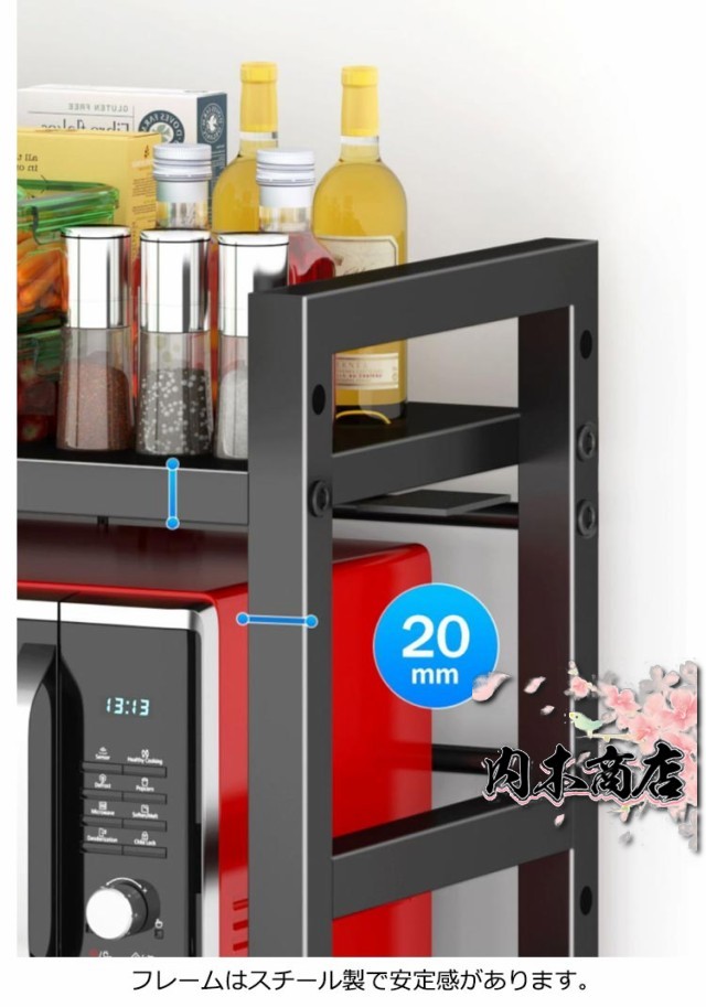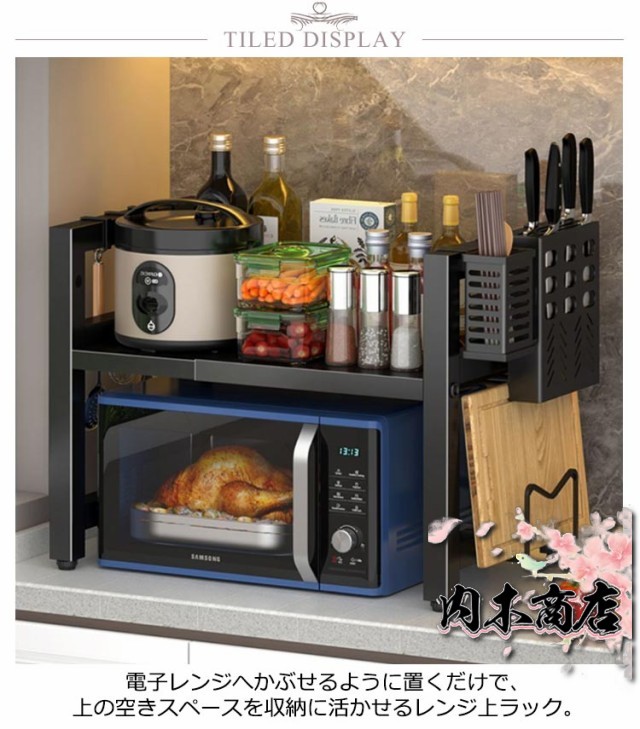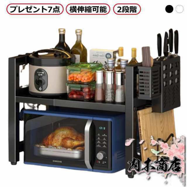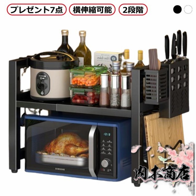 | プレゼント7点 横伸縮可能 2段階 電子レンジへかぶせるように置くだけで、上の空きスペースを収納に活かせるレンジ上ラック。 こちらのラックを使えば、上部のスペースを有効活用することができます。 耐荷重は約75kgなので、キッチン家電や小物、調味料など置ける丈夫さ。 幅は約40?63cmの間で伸縮でき、レンジの大きさやスペースに合わせて幅を調節できます。 棚の高さは2段階調節ができるます。棚下の高さは最大で(約)43cmにでき大型レンジや背の高い調理器具などを収納することができます。 フレームはスチール製で安定感があります。 サイドにフックが付いて、お玉などのキッチンツールなどを掛けるのに便利 シンプルなデザインだから圧迫感がありません。 | |