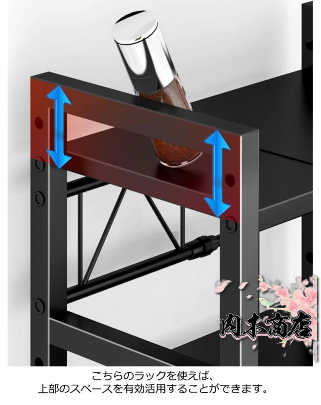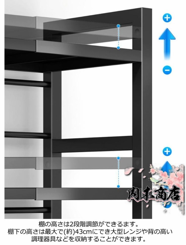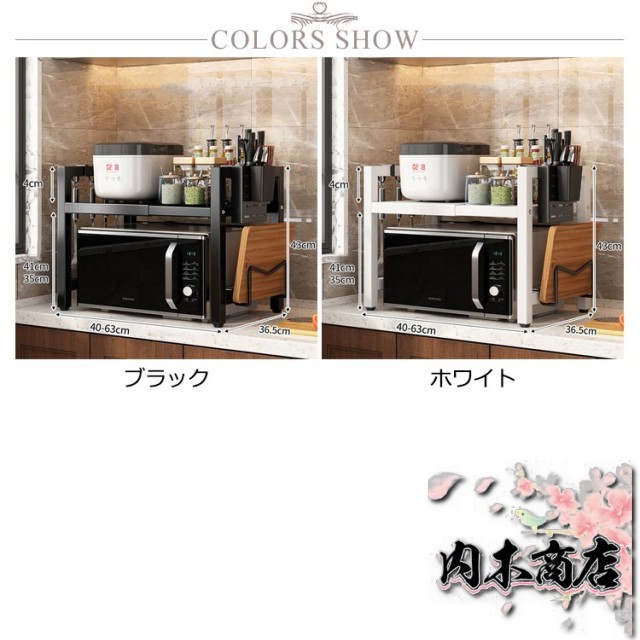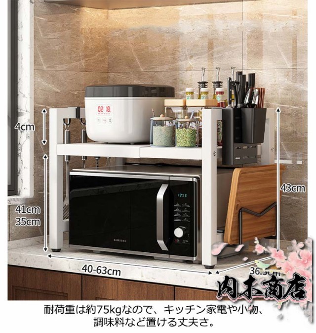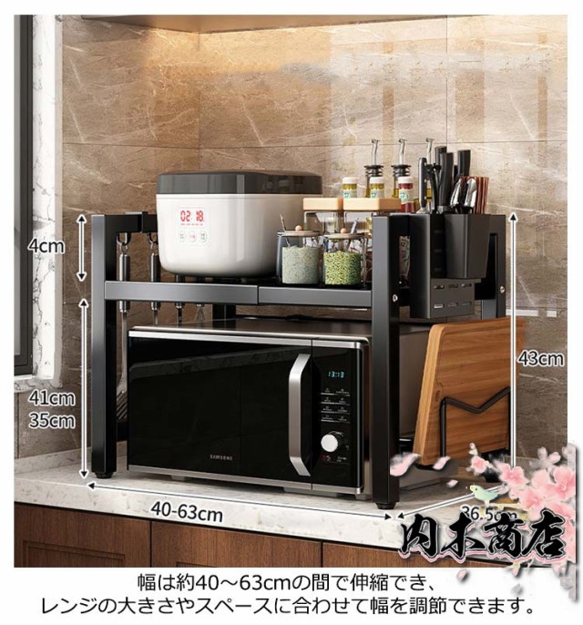 レンジ上ラック 高さ 調節 2段階調整 幅40-63cm(伸縮可能) 伸縮レンジラック レンジ上 ラック キッチンラック レンジ台 レンジ棚 1段 キッチン収納 大型レンジ対応 電子レンジ台 トースター 炊飯器 ラック レンジ置台 カウンター上 収納 卓上