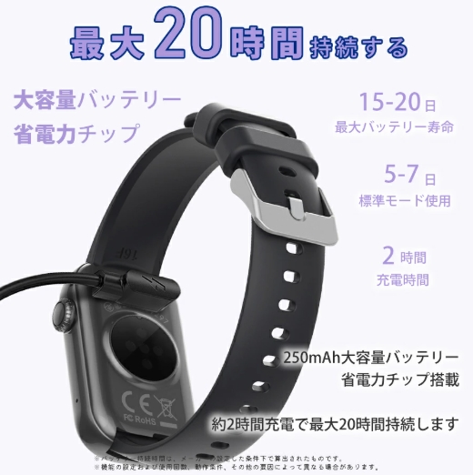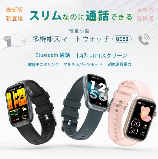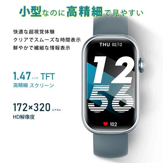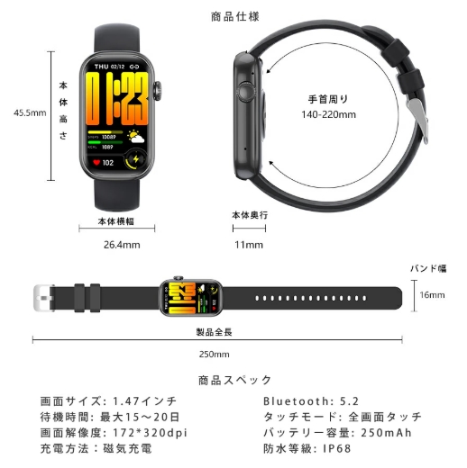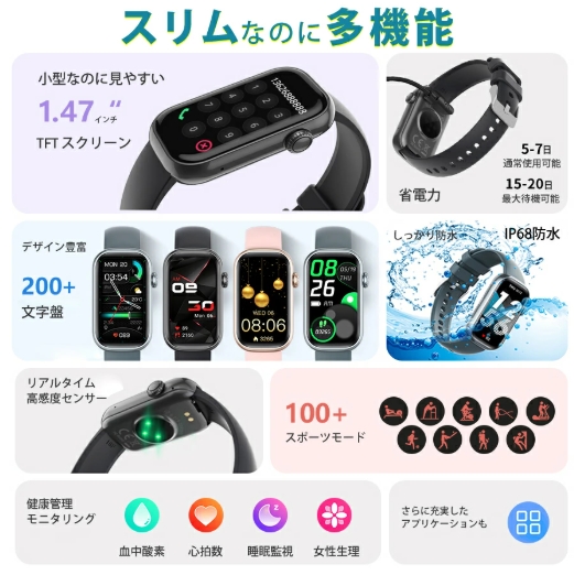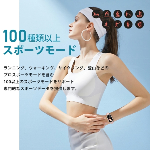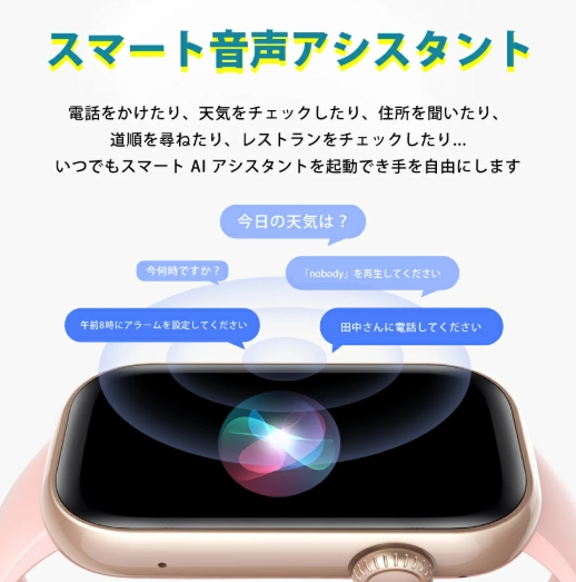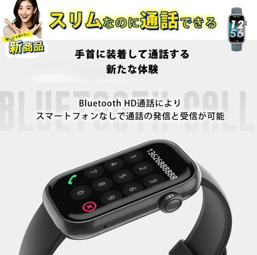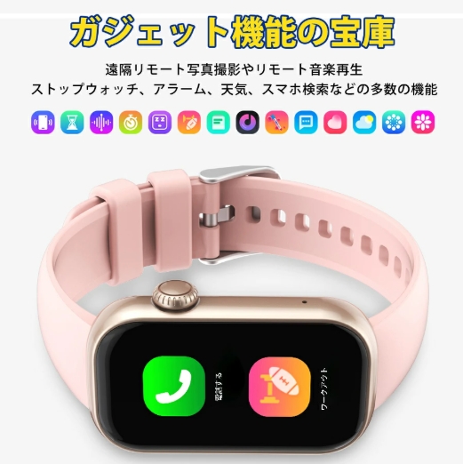 機能 通話機能、睡眠モニター、座りがち、女性生理周期、多機能健康管理、着信通知/拒否、多種の運動モード、カメラ遠隔操作、ミュージック、アラーム、明るさ調節 、天気予報、節電モード、壁紙自由、ストップウォッチ、カウントダウン、腕上げ点灯、携帯探し…