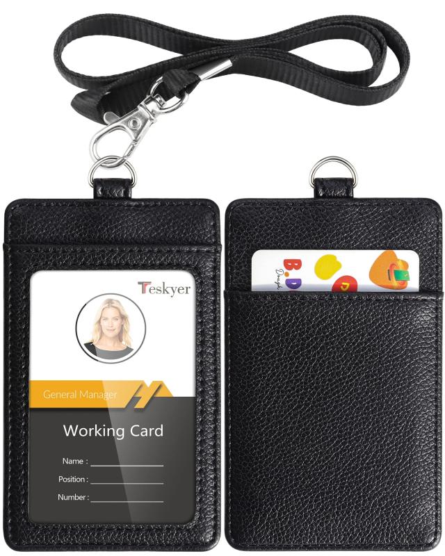 Teskyer IDカードホルダー ネームホルダー 本革 名札ホルダー カードケース 縦型 社員証 ネックストラップ 吊り下げ カード入れ パスケー