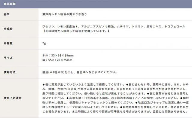 | 成分 | ワセリン、レモン果皮油*、アルガニアスピノサ核油、ハチミツ、トウミツ、酒粕エキス、トコフェロール 【*は植物から抽出した精油を使用しています。】 |