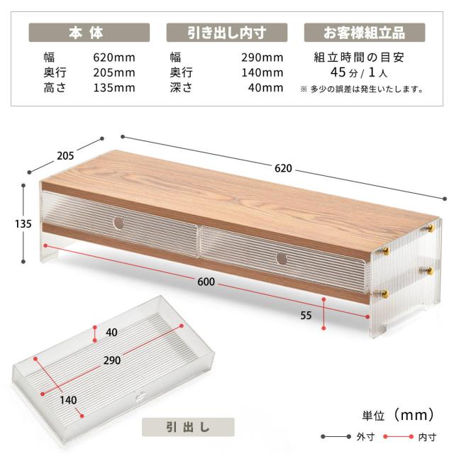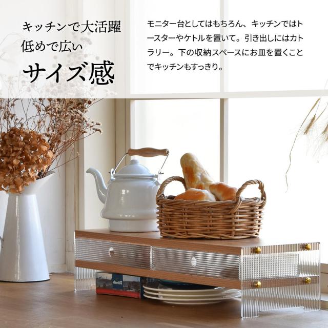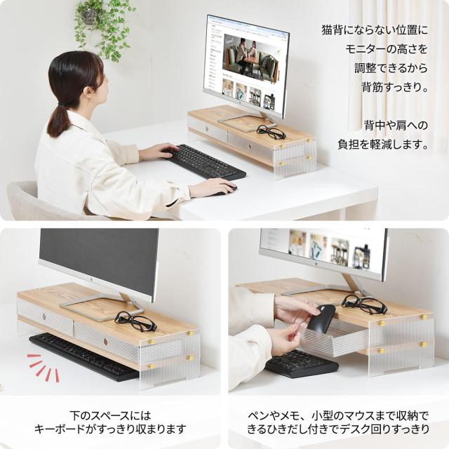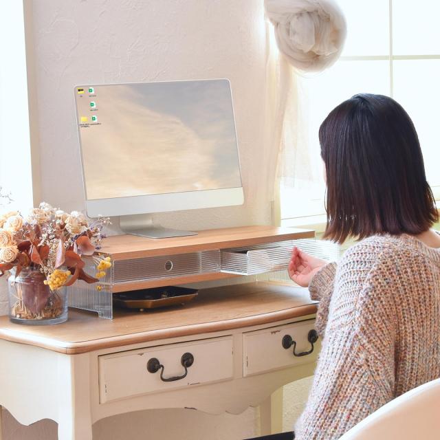 アクリルの抜け感 モニター台 幅62 【送料無料】 モニターラック アクリル 引き出し 収納付き おしゃれ 可愛い 木製 天板
