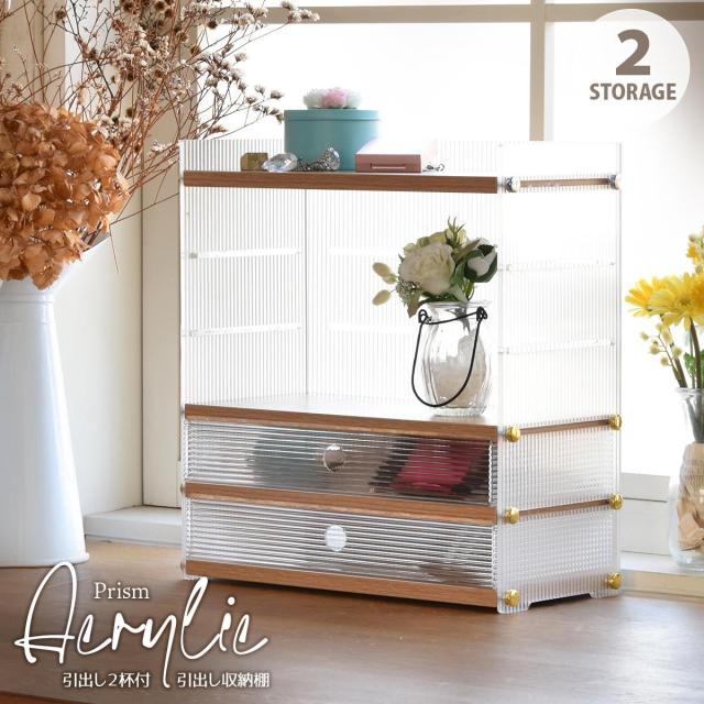 明るいアクリルの抜け感 卓上シェルフ 【送料無料】 アクリル 引き出し 2段 収納付き おしゃれ 可愛い 木製 天板 卓上収納 アクセサリー収納 コスメ収納