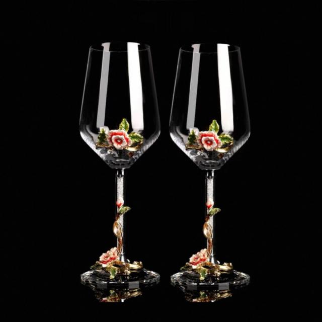 上品で華やかなレッドローズが美しくデザインされた、エレガントなペアワイングラス。