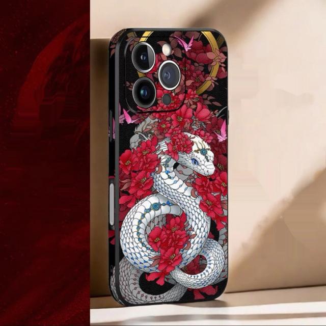 PUレザー小羊皮 iPhoneケース 白蛇と赤い花デザイン スマホカバー 高級感