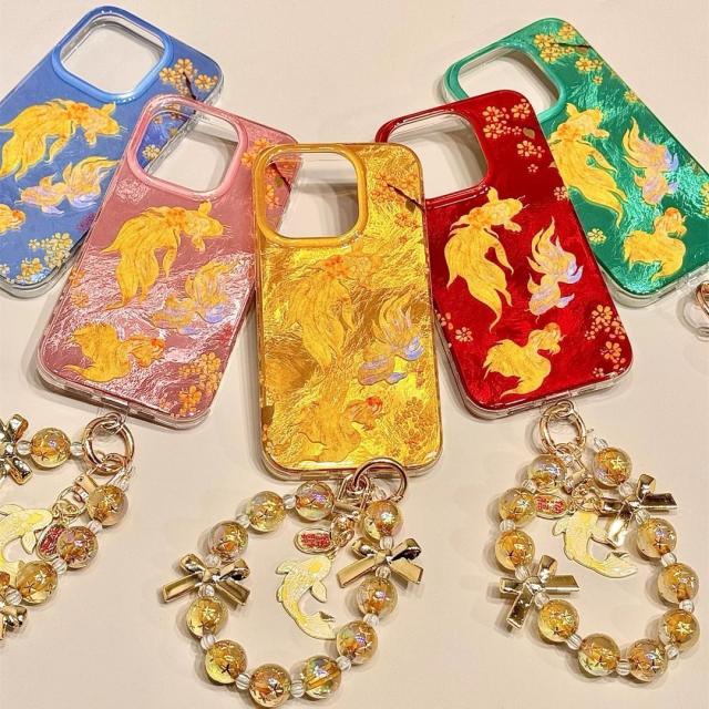 華やかで上品な和風iPhoneケースと金魚チャームブレスレットの豪華セット。