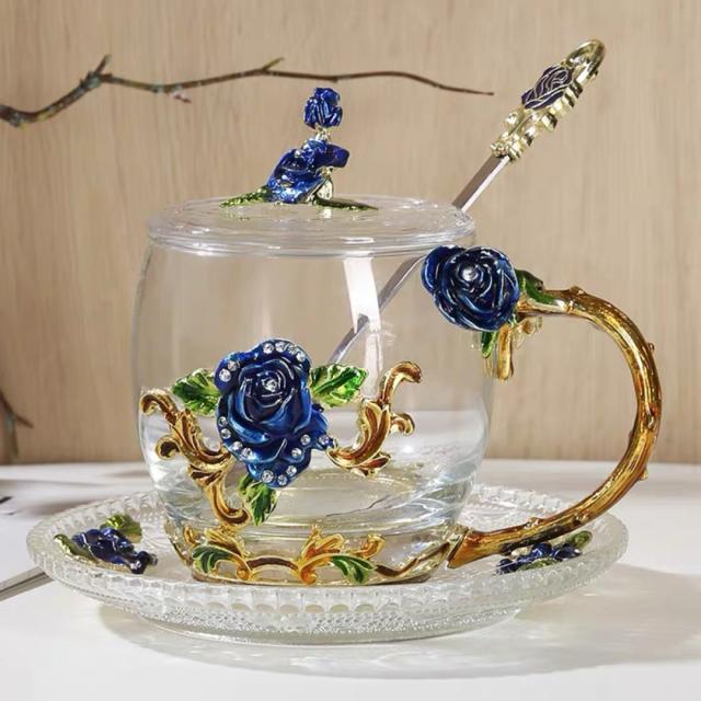 ブルーバラ花柄 ガラス製 .ティーカップ 4点セットコーヒーカップ