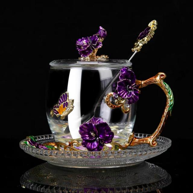 紫バラ花柄 ガラス製 .ティーカップ 4点セットコーヒーカップ